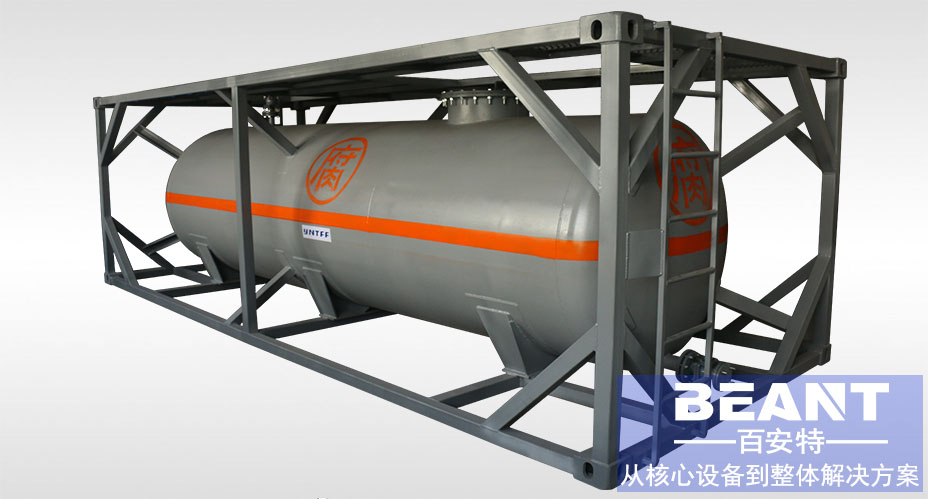 罐體四周有起保護(hù)和吊裝作用的角部承力框架。罐箱的外部框架尺寸完全等同于國(guó)際標(biāo)準(zhǔn)20集裝箱的尺寸(長(zhǎng)20英尺,寬:8英尺,高:8英尺6英寸)。可用于公路,鐵路及水上運(yùn)輸。可裝載高達(dá)到14300到31000升(甚至更大)的流體貨物。